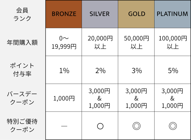 年間購入金額に応じた4つのステータスごとに