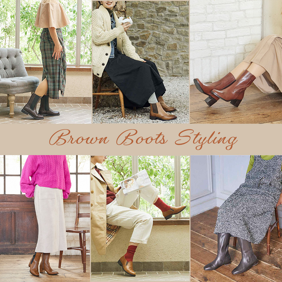 茶色のブーツは、定番の黒ブーツと並んで人気のアイテム。