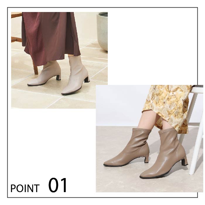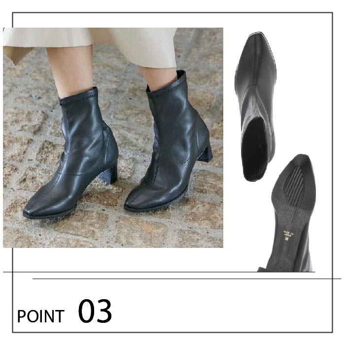 通常ブーツだと足首周りがどうしても固くなりがち。でもこのブーツなら甲の部分までストレッチ素材なので足首も動きやすく、むくみにくいんです。